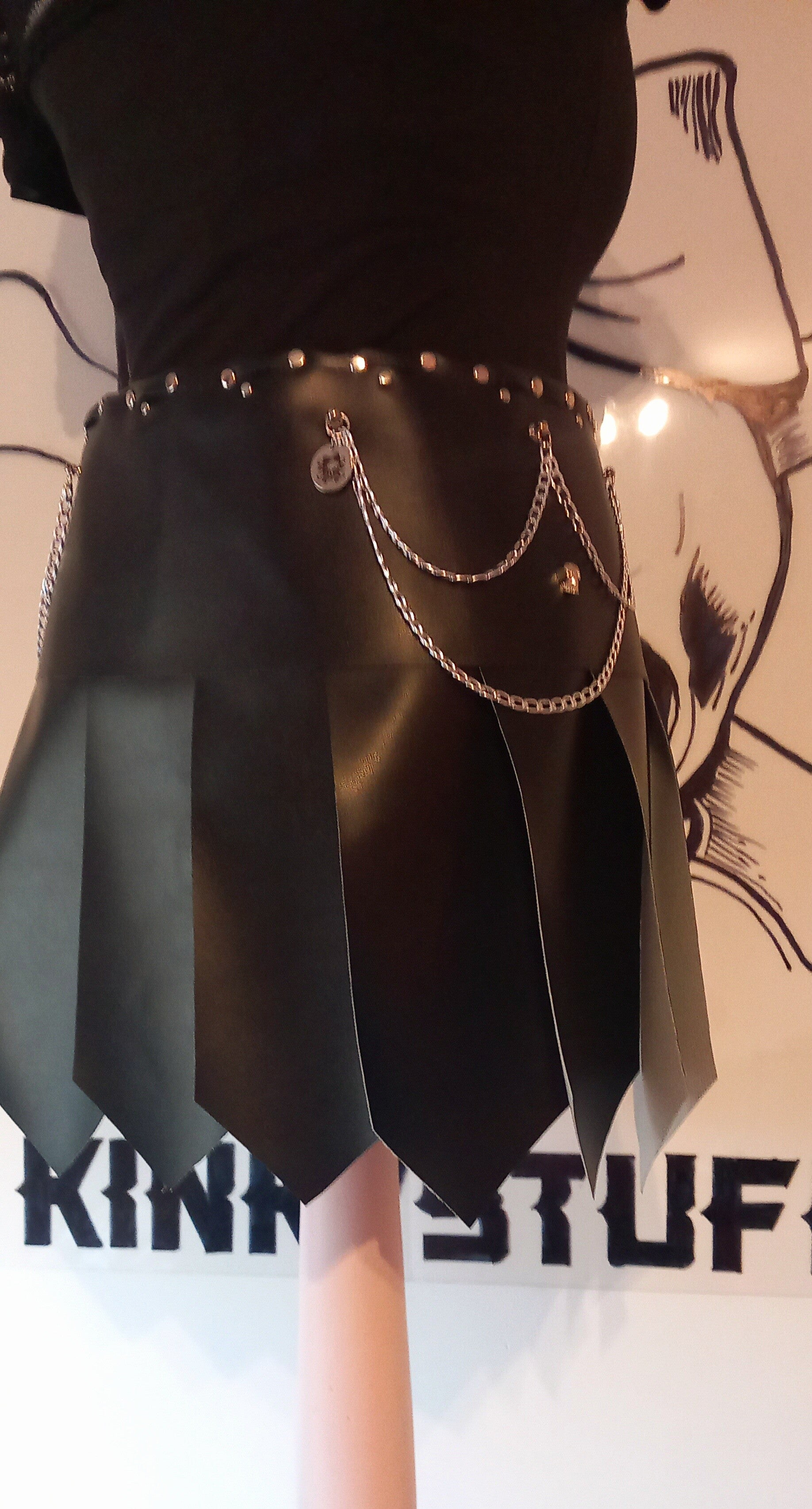 Deze stoere zwarte lederen rok met speelse splitten en zilverkleurige kettingen straalt pure kracht en rebellie uit. De studs en kettingdetails geven een edgy touch, perfect voor kinky feestjes, gothic looks of alternatieve festivals. Handgemaakt en verstelbaar voor een comfortabele en sexy pasvorm!