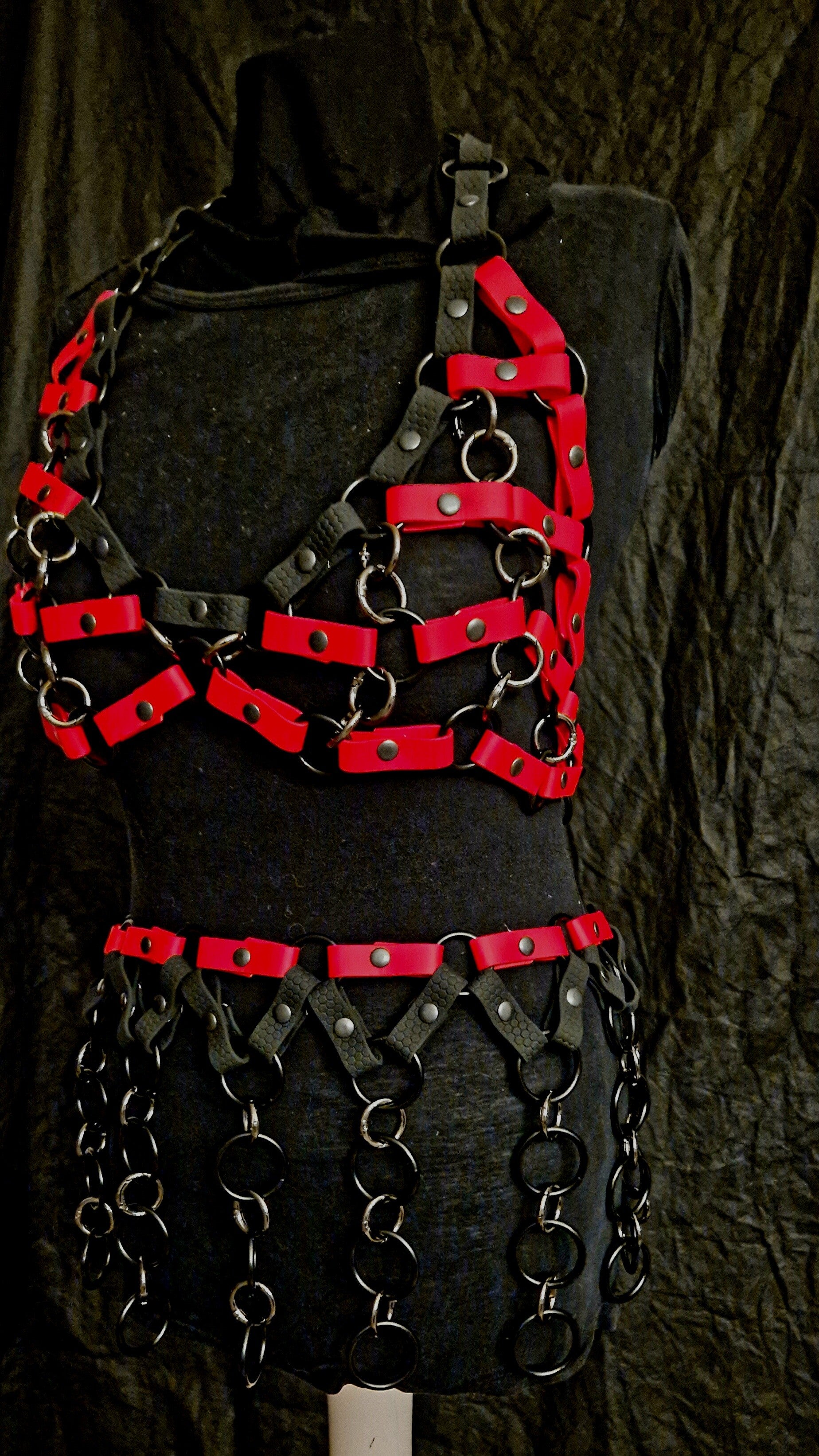 Laat je vurige kant zien met deze verleidelijke rood-zwarte chainmail set! Gemaakt van stevige metalen ringen en synthetisch leer, met strategisch geplaatste kettingen voor een gedurfde look. Perfect voor raves, BDSM-events of als een statement piece in je garderobe. Durf jij het aan? πβ€οΈπ₯