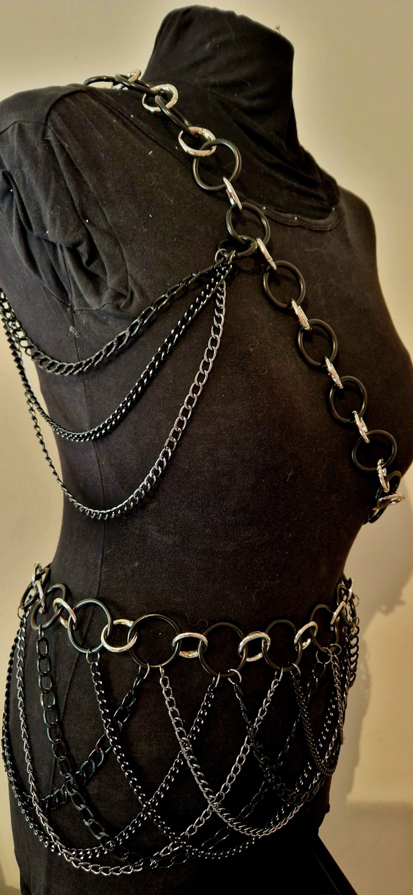 Deze tweedelige set bestaat uit een asymmetrische top met grote ringen en vallende kettingen die je lichaam omranden als een visueel pantser. De bijpassende rokriem sluit daar naadloos bij aan met een gelaagd kettingweb dat de heupen accentueert – sensueel, stoer en perfect in balans. ⛓️✨