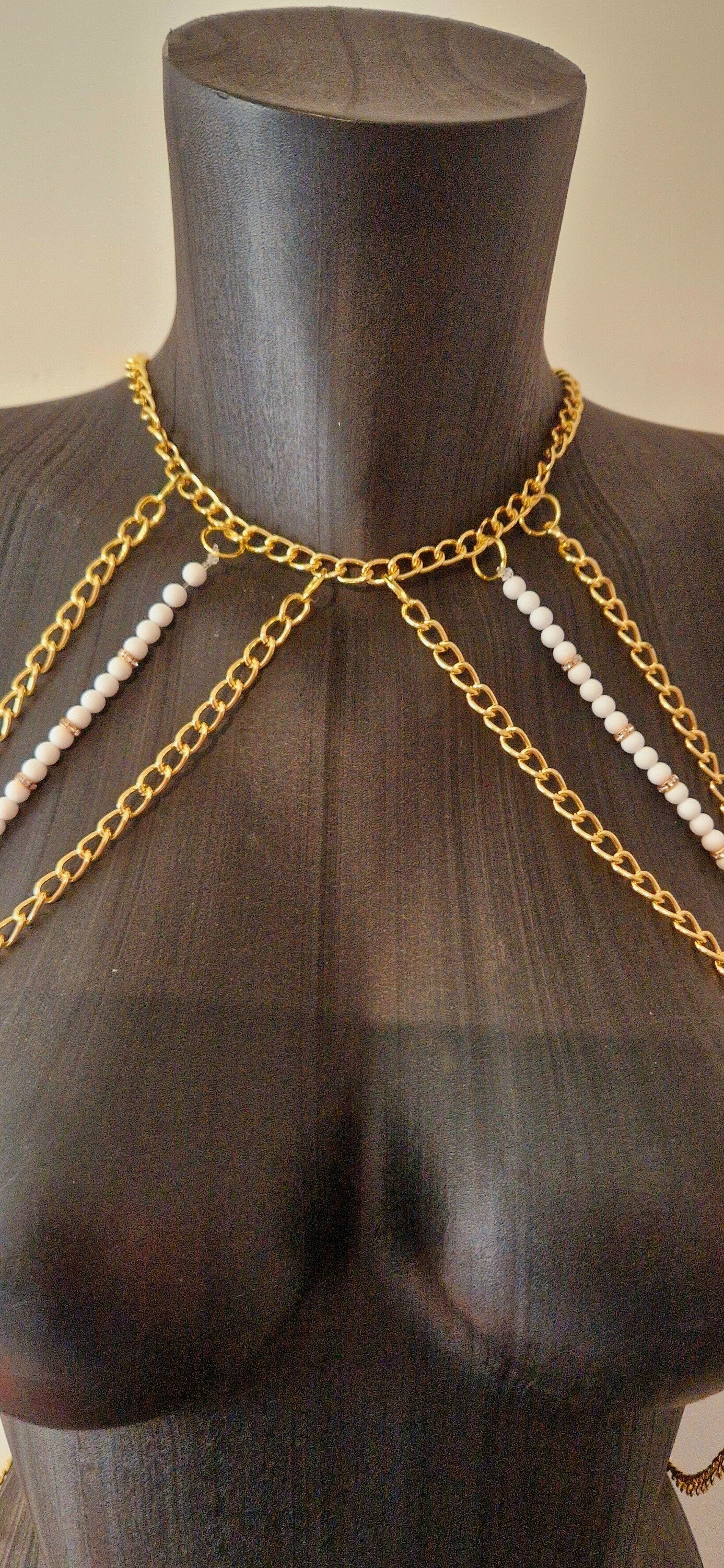 De Golden Mirage is een luxueuze handgemaakte bodychain die vrouwelijke elegantie en feestelijke glamour samenbrengt. Dit unieke ontwerp omlijnt het lichaam met warme kettingen in een geometrische vorm, gecombineerd met fijne witte kralen en roségoudkleurige details voor een dromerige, verfijnde uitstraling.