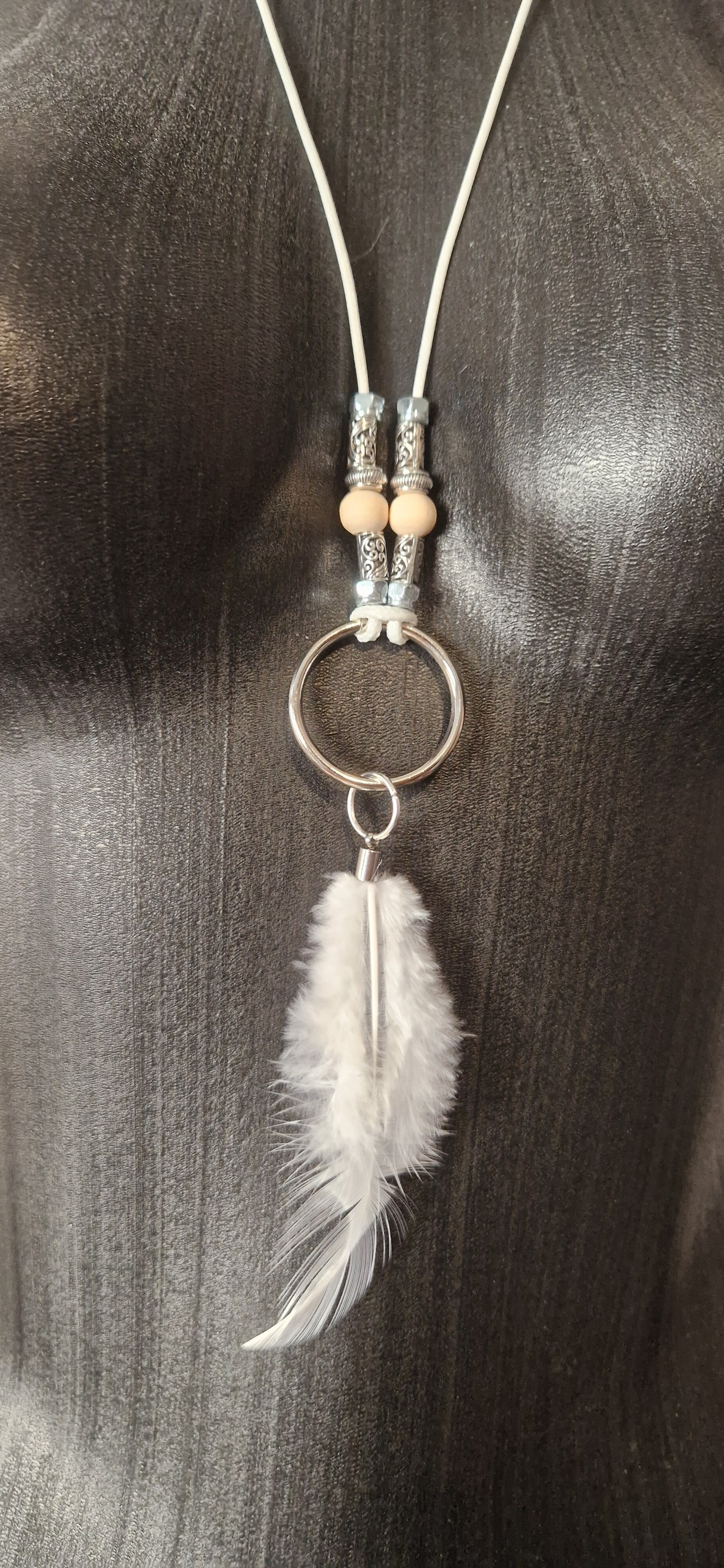 Deze handgemaakte ketting is jouw ultieme accessoire voor een white party π€. Het witte koord, de licht houten kralen en zilverkleurige details stralen beachy boho vibes uit ποΈ. De grote ring met zachte witte veer zorgt voor een stijlvolle, spirituele touch π¬οΈ.