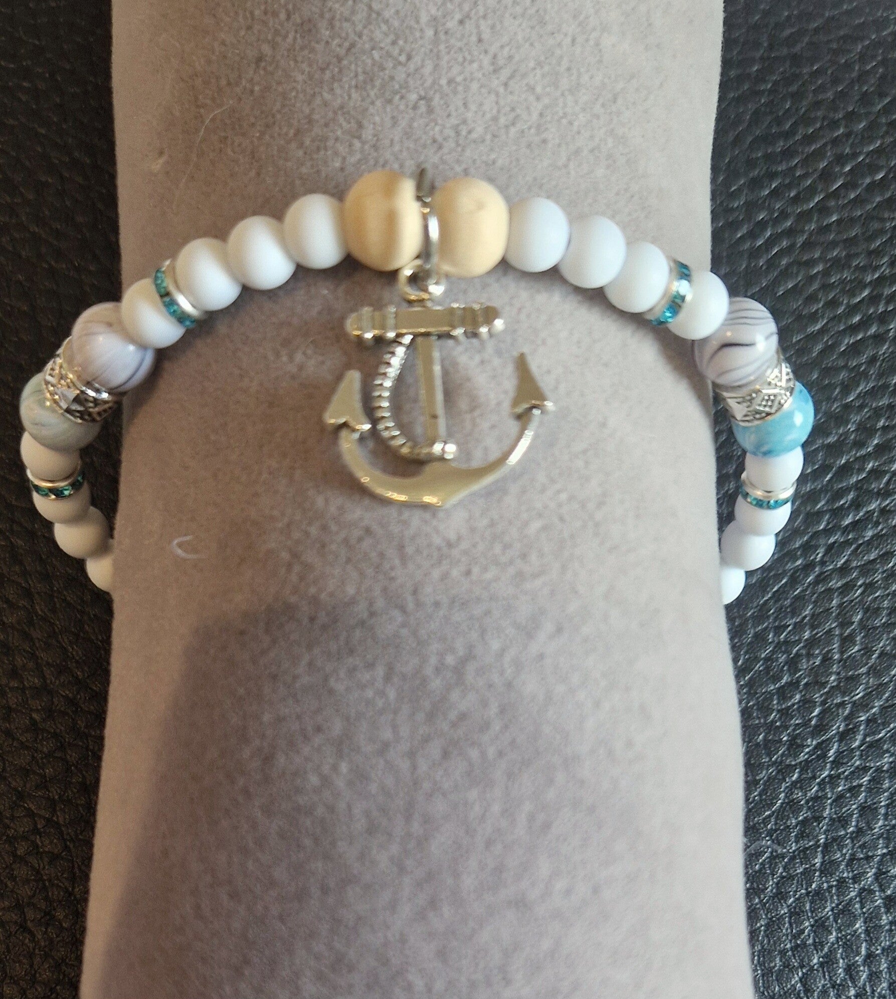 Materiaal: houten kralen, matte witte kralen, stalen spacer details, ankerbedel