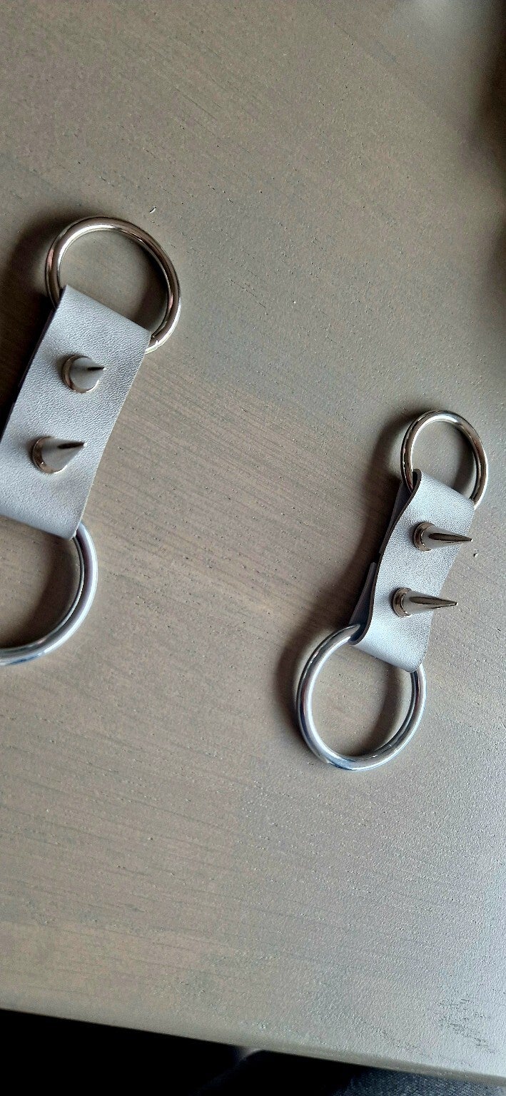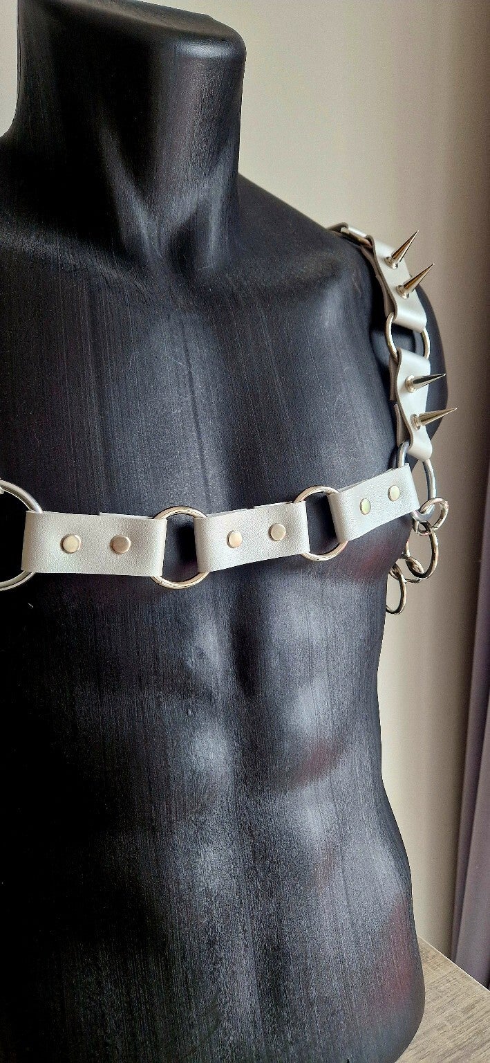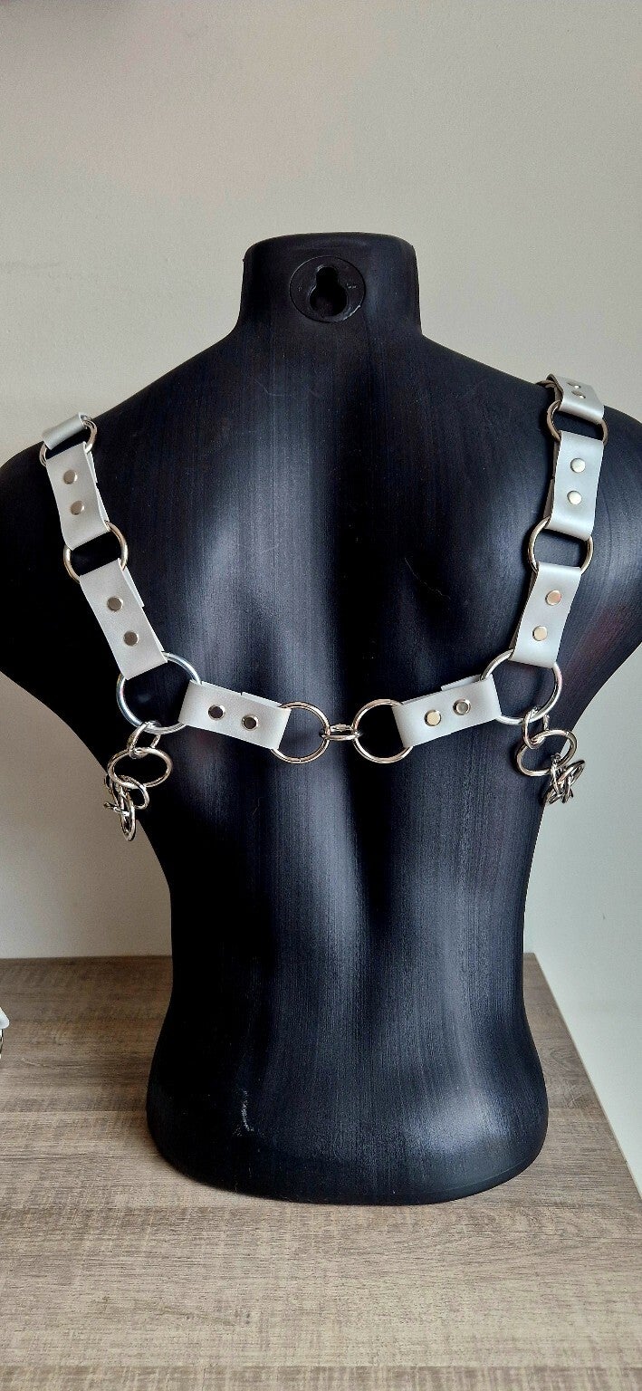 Het zilver/wit parelmoer leer weerspiegelt het licht subtiel en vangt elke blik, terwijl de stevige metalen ringen en studs jouw aanwezigheid versterken. De strakke lijnen en symmetrie accentueren je silhouet en maken duidelijk wie hier de controle heeft.