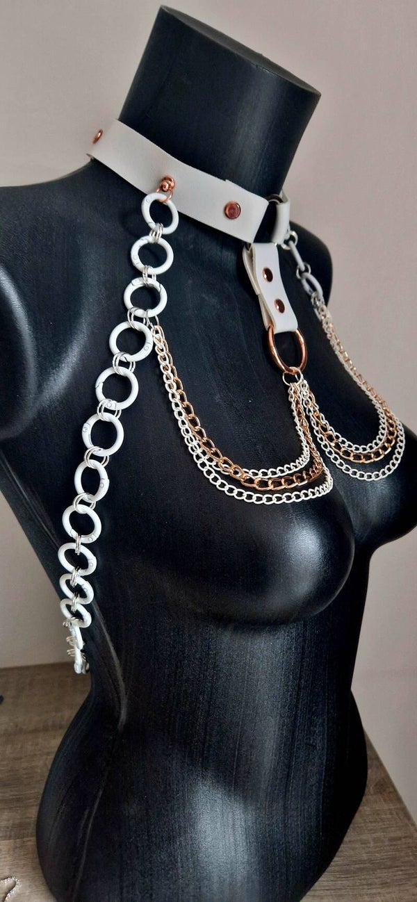 Met witte en roségouden kettingen die subtiel over de borsten vallen, creëert dit ontwerp een opvallende en toch verfijnde look. De grote witte ringen en details in roségoud zorgen voor een moderne, chique uitstraling.