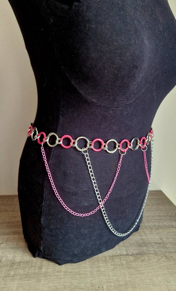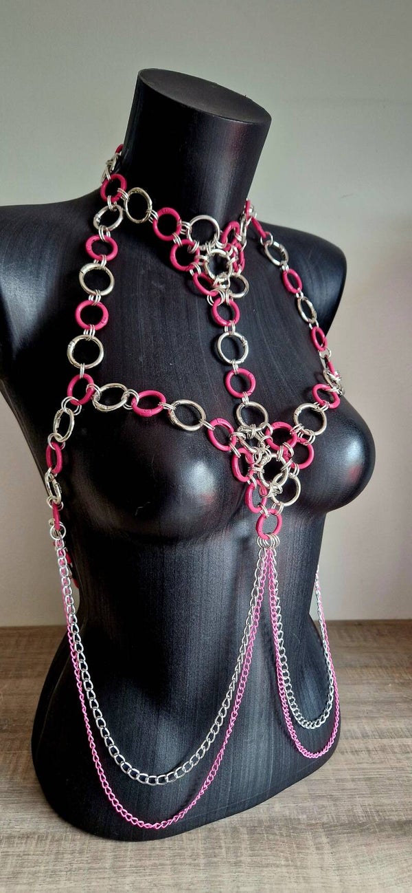 De Pink Voltage set uit de Candy Kink Collection is een speelse mix van kleur en kracht. Roze en zilverkleurige karabijnringen vormen de basis van dit opvallende ontwerp, verbonden met kleine zilveren ringetjes tot een elegant maar rebels lijnenspel. De roze en zilveren kettingen voegen beweging en flair toe – perfect voor wie wil opvallen op een party, tijdens een shoot of in de slaapkamer.