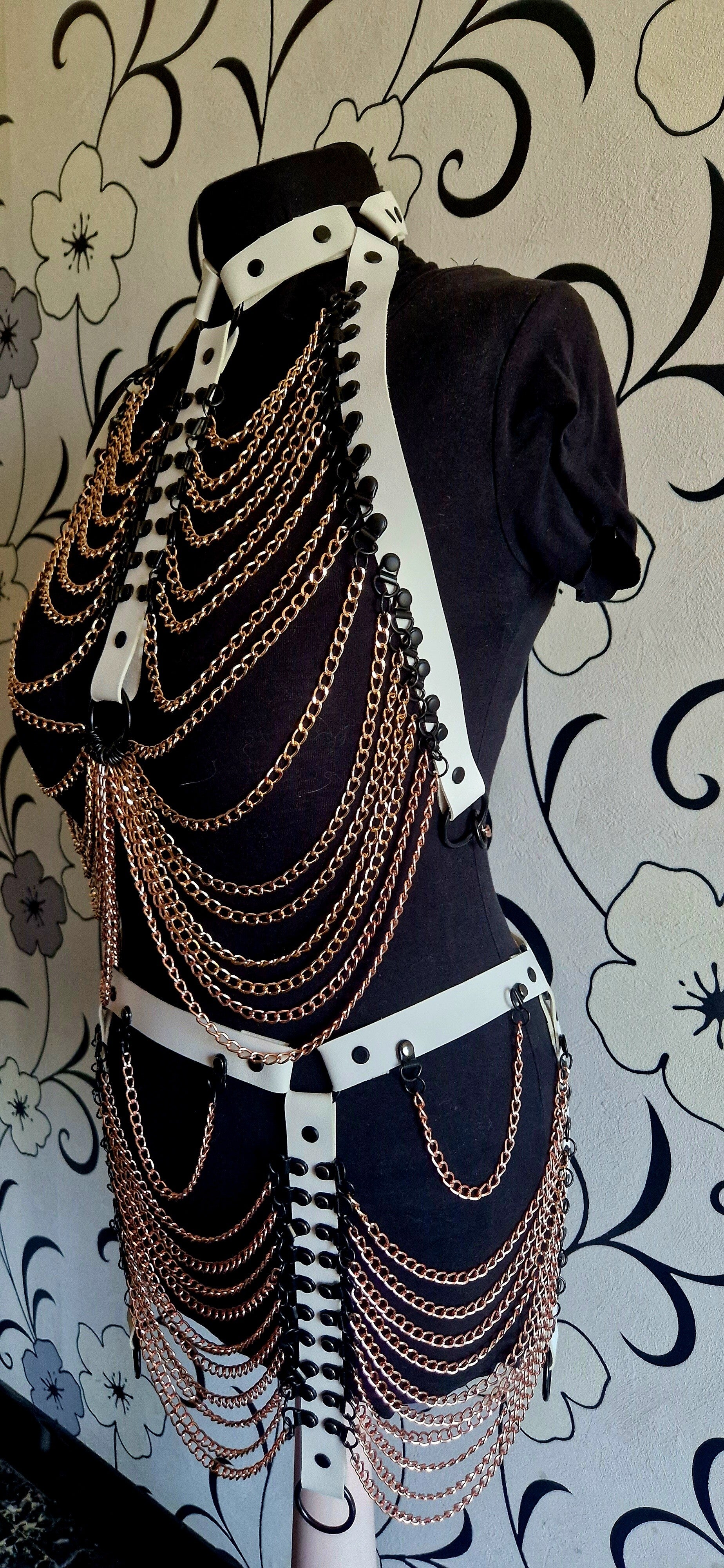 Deze luxueuze combinatie van ivoorwitte banden en roségouden kettingen laat een blijvende indruk na — sensueel, krachtig en onmiskenbaar exclusief.