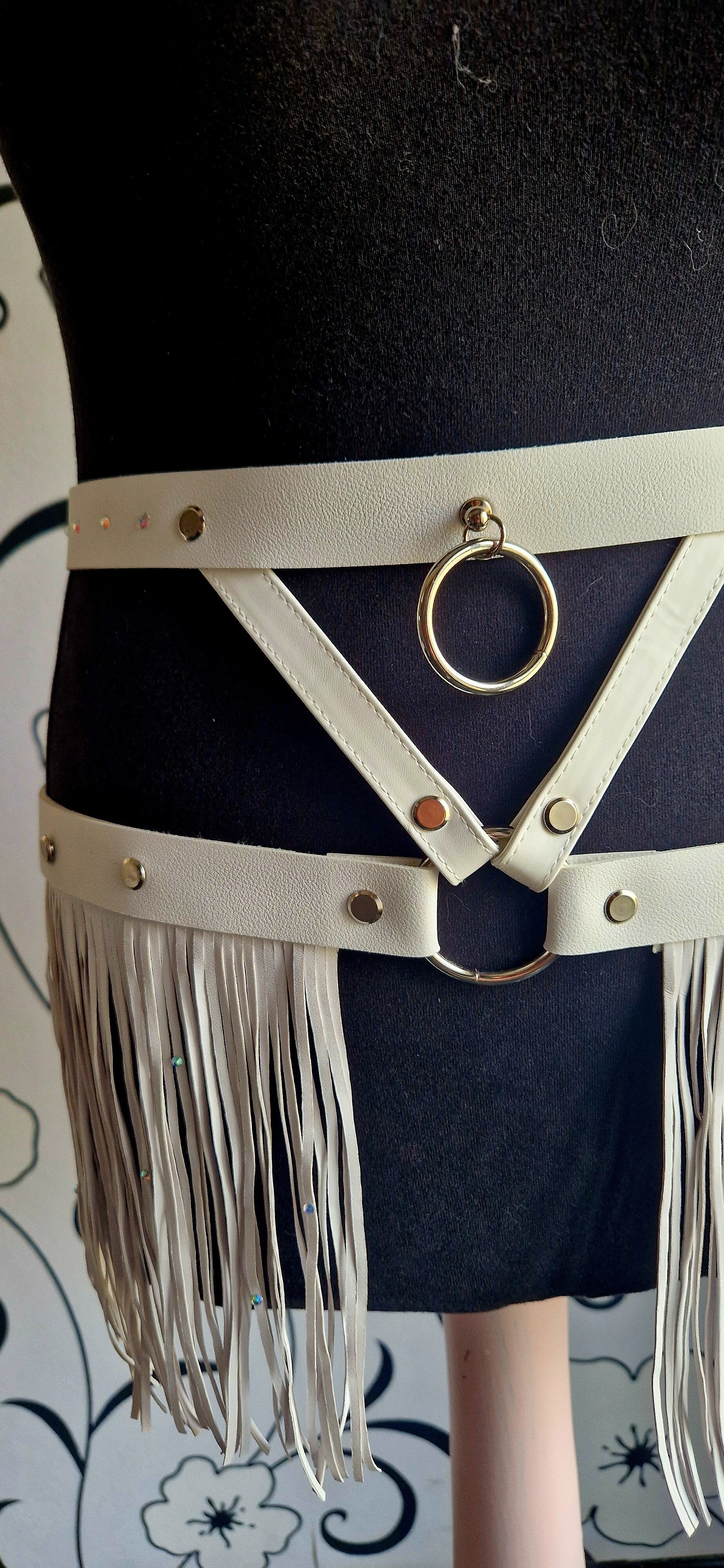 Deze handgemaakte heupriem in wit kunstleer is afgewerkt met glinsterende strass steentjes op de bovenste riem én subtiel verspreid over de fringe voor een extra sprankelende touch.