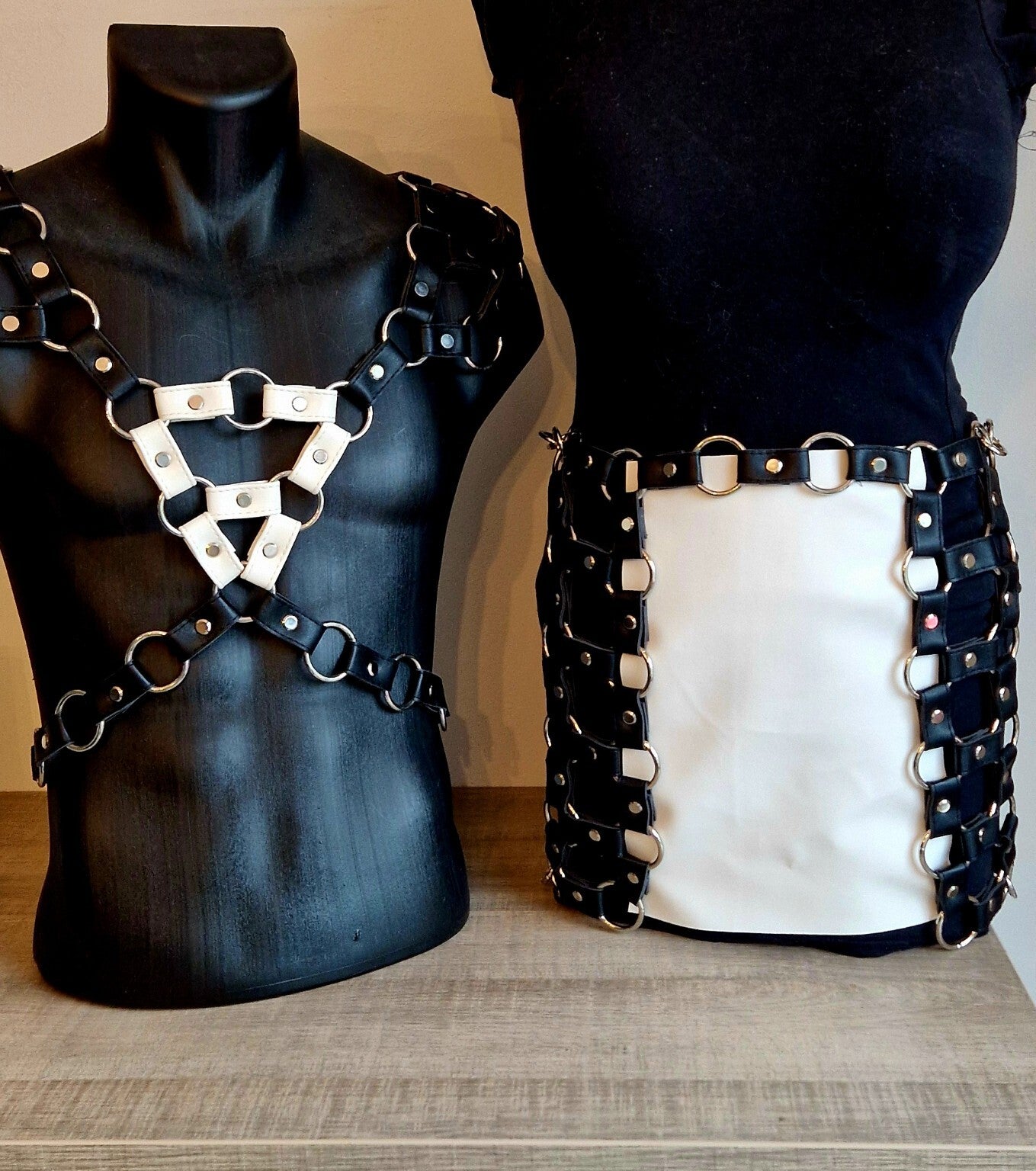 De Noir Blanc Set combineert een krachtig harnas met een bijpassende rok, volledig handgemaakt in diepzwart leer met helderwitte accenten. Het sterke contrast van deze kleuren geeft de set een unieke, dominante uitstraling die direct de aandacht opeist.