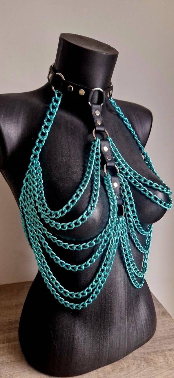 De Poison Kiss combineert luxueuze mintgroene Italiaanse aluminium kettingen met dominant zwart leer tot een onweerstaanbaar statement piece.