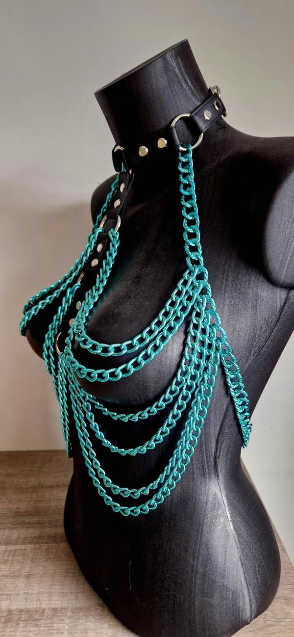 Elke drapering is met de hand geplaatst voor een vloeiende, sensuele beweging over het lichaam. Het zwarte lederen halster zorgt voor structuur en attitude, terwijl de hoogwaardige Italiaanse kettingen jouw vormen elegant benadrukken.