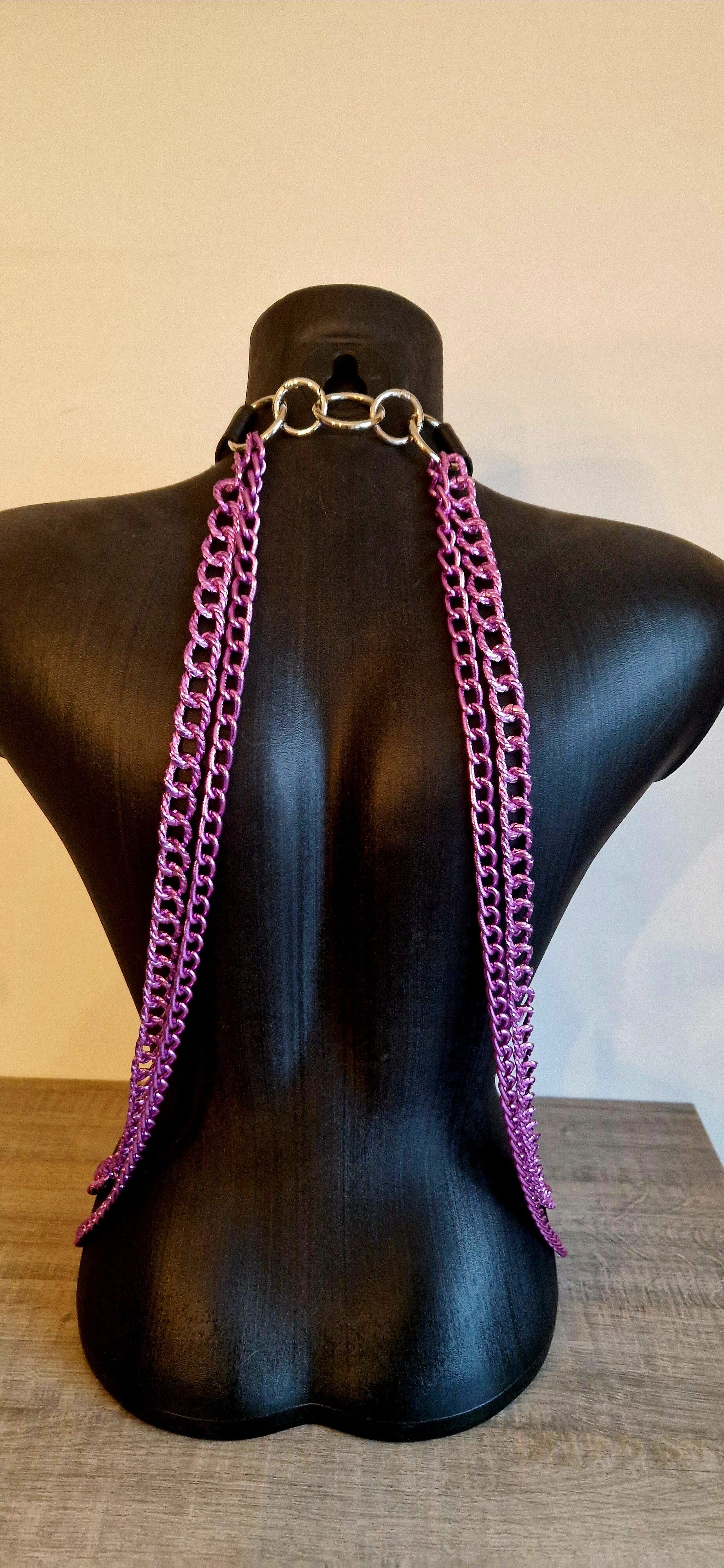 Elegante kettinglijnen vloeien vanuit de hals naar één centrale ring, waar een speelse cascade van hangertjes de aandacht trekt. Vanaf daar lopen de kettingen verder naar beneden en creëren ze een lang, slank en hypnotiserend silhouette.