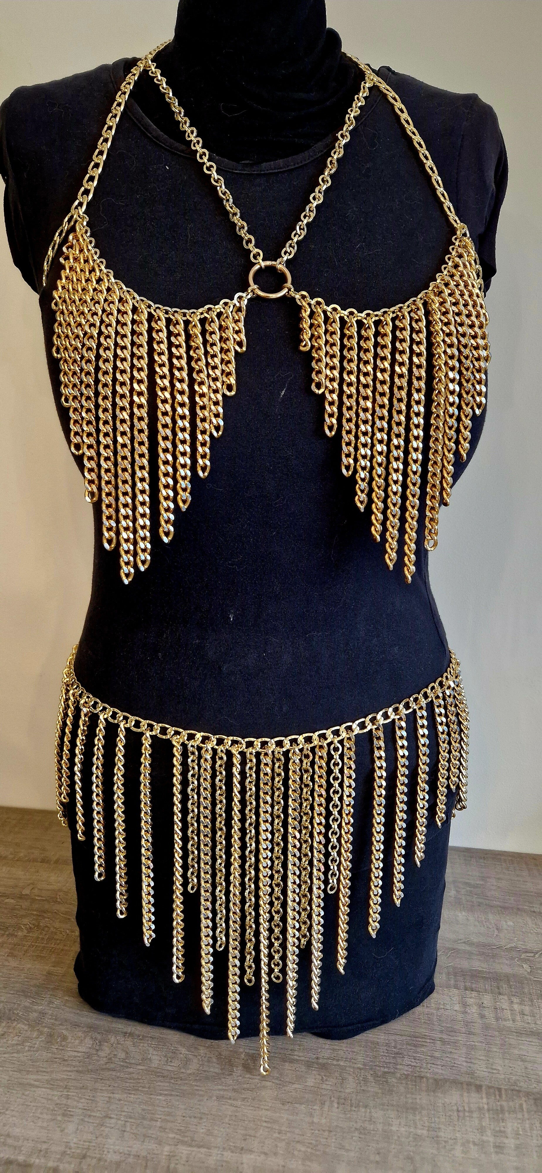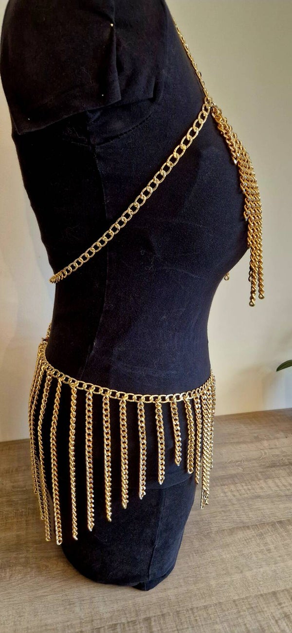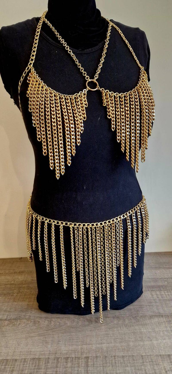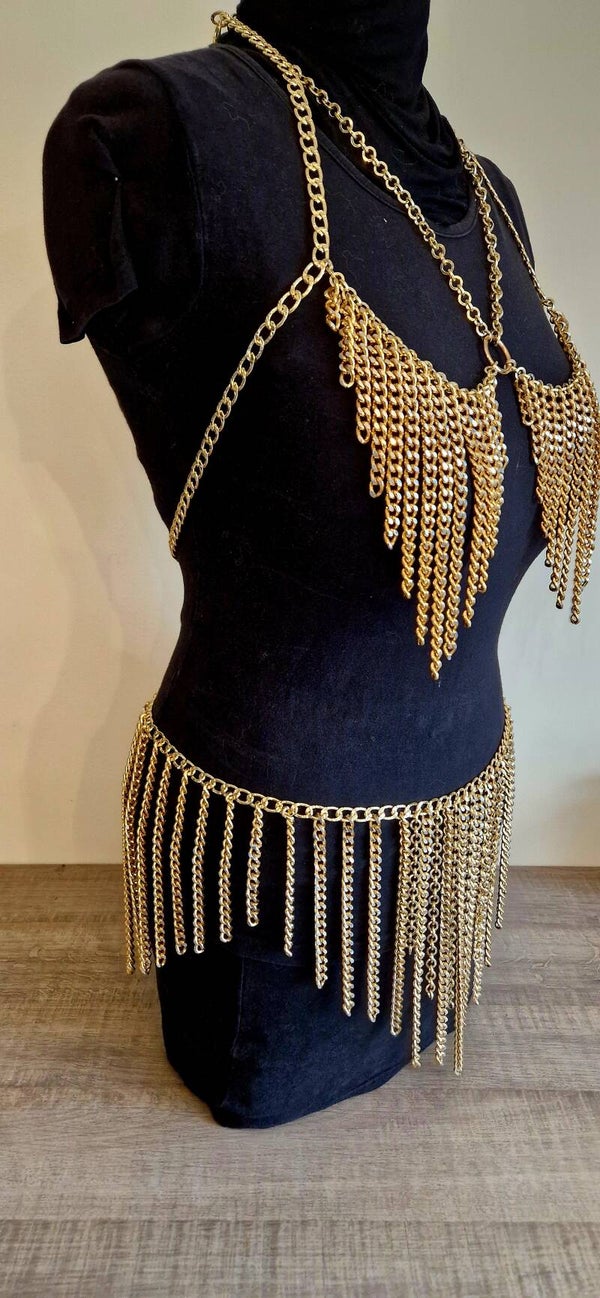 Dit handgemaakte ontwerp bestaat uit een top en rok die samen één harmonieus silhouet vormen. Rijke goudkleurige kettingen omarmen het lichaam en bewegen mee bij elke stap. De speels vallende franjes creëren een hypnotiserend shimmer-effect, terwijl de centrale ring het ontwerp visueel verankert en versterkt.