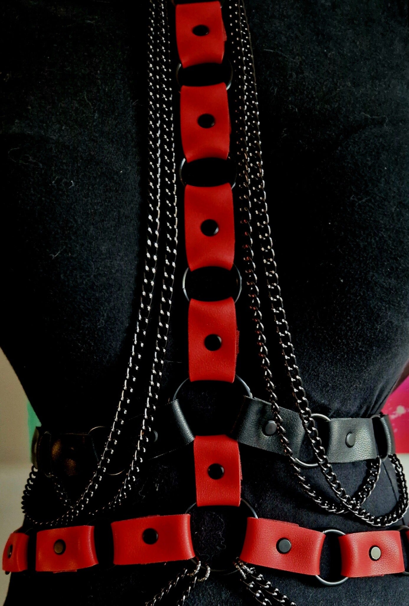 De krachtige rode verticale as vormt het middelpunt van dit ontwerp en creëert een uitgesproken silhouet van nek tot heup. Robuuste ringen en zwarte kettingen brengen structuur en beweging samen in één dominant geheel.
