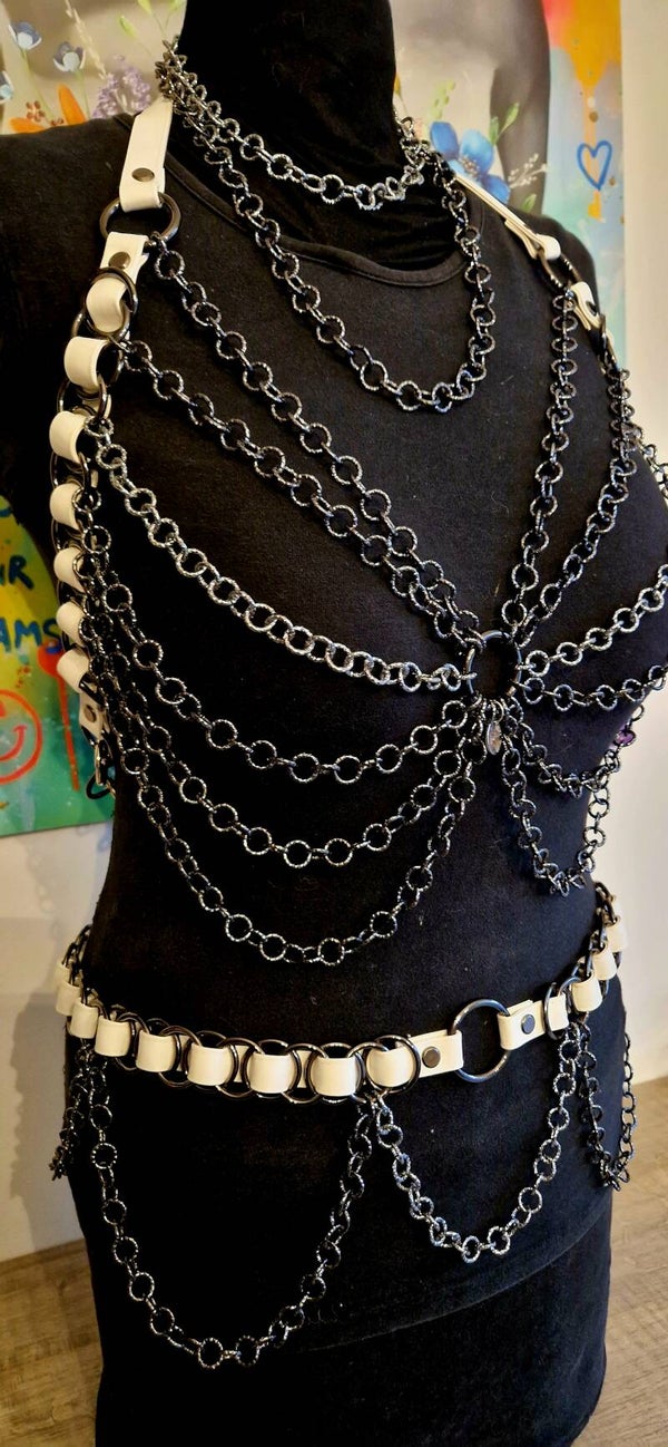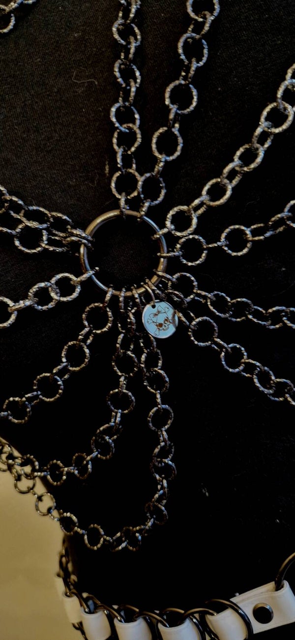 Een krachtig statement piece waarin verbinding, structuur en sensualiteit samenkomen. De Nexus Web harness is handgemaakt uit een netwerk van zwarte kettingen die vanuit een centrale ring over het lichaam waaieren en een opvallend web van schakels vormen.