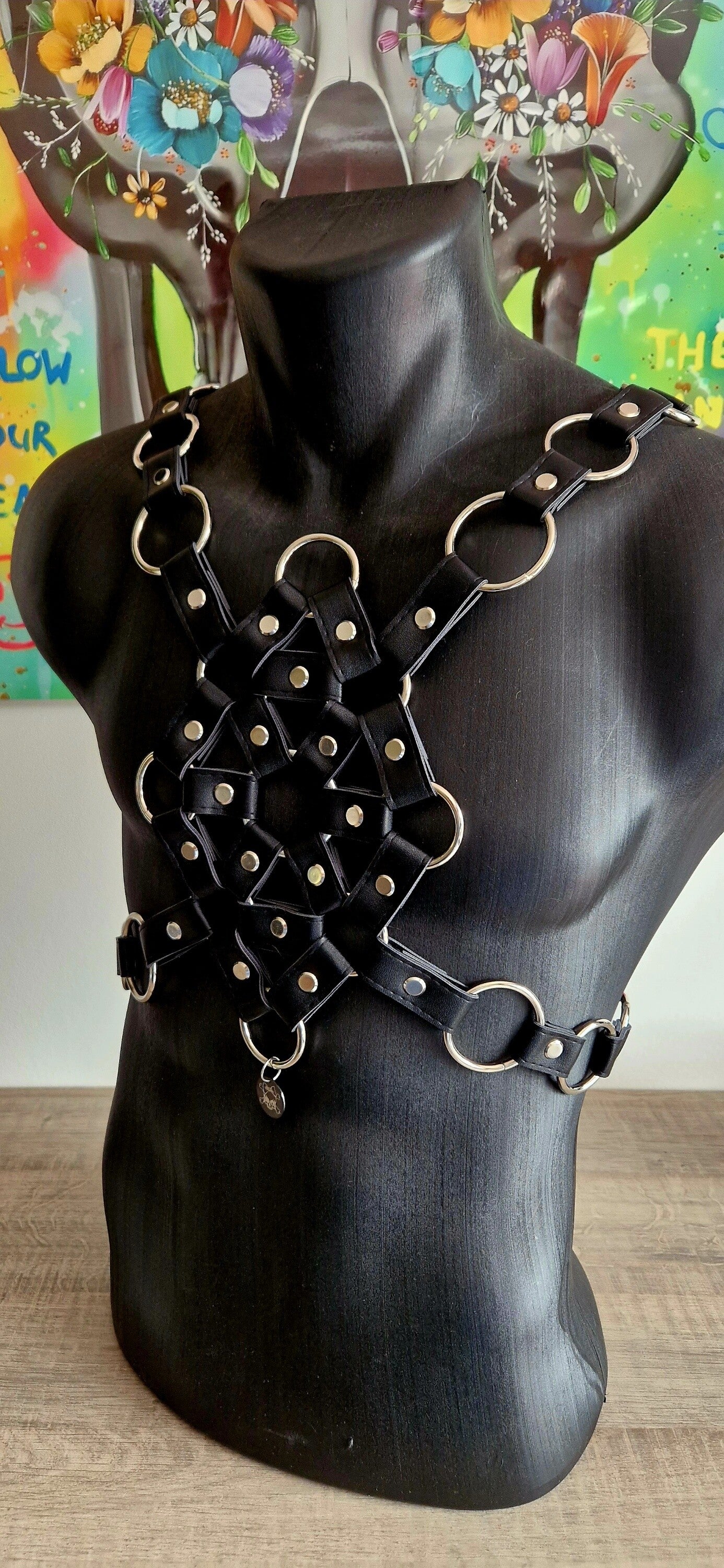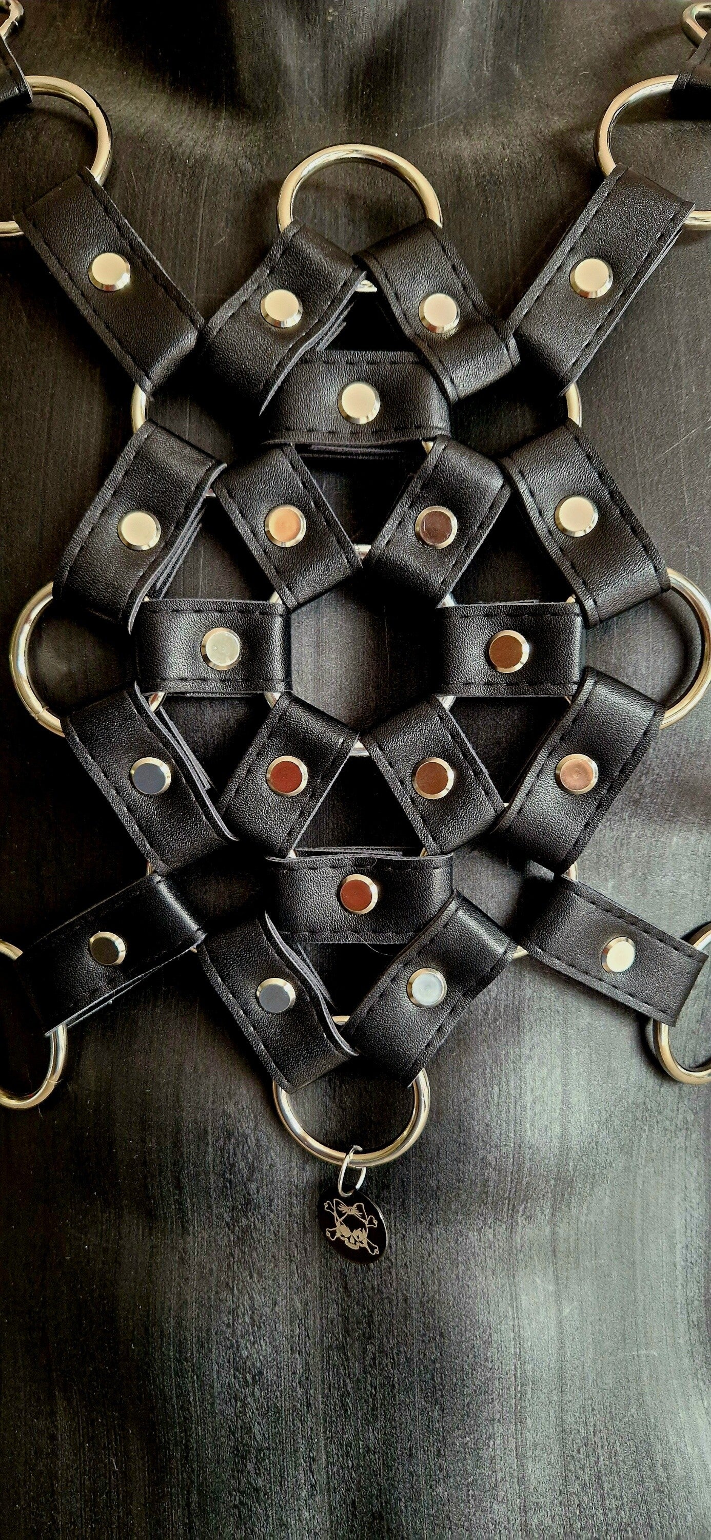 Het centrale ontwerp is opgebouwd uit een krachtige ringstructuur met verbonden leersegmenten, waardoor een bijna armor-achtige uitstraling ontstaat. Het resultaat is een opvallend harness dat tegelijk stoer, dominant en uniek oogt.