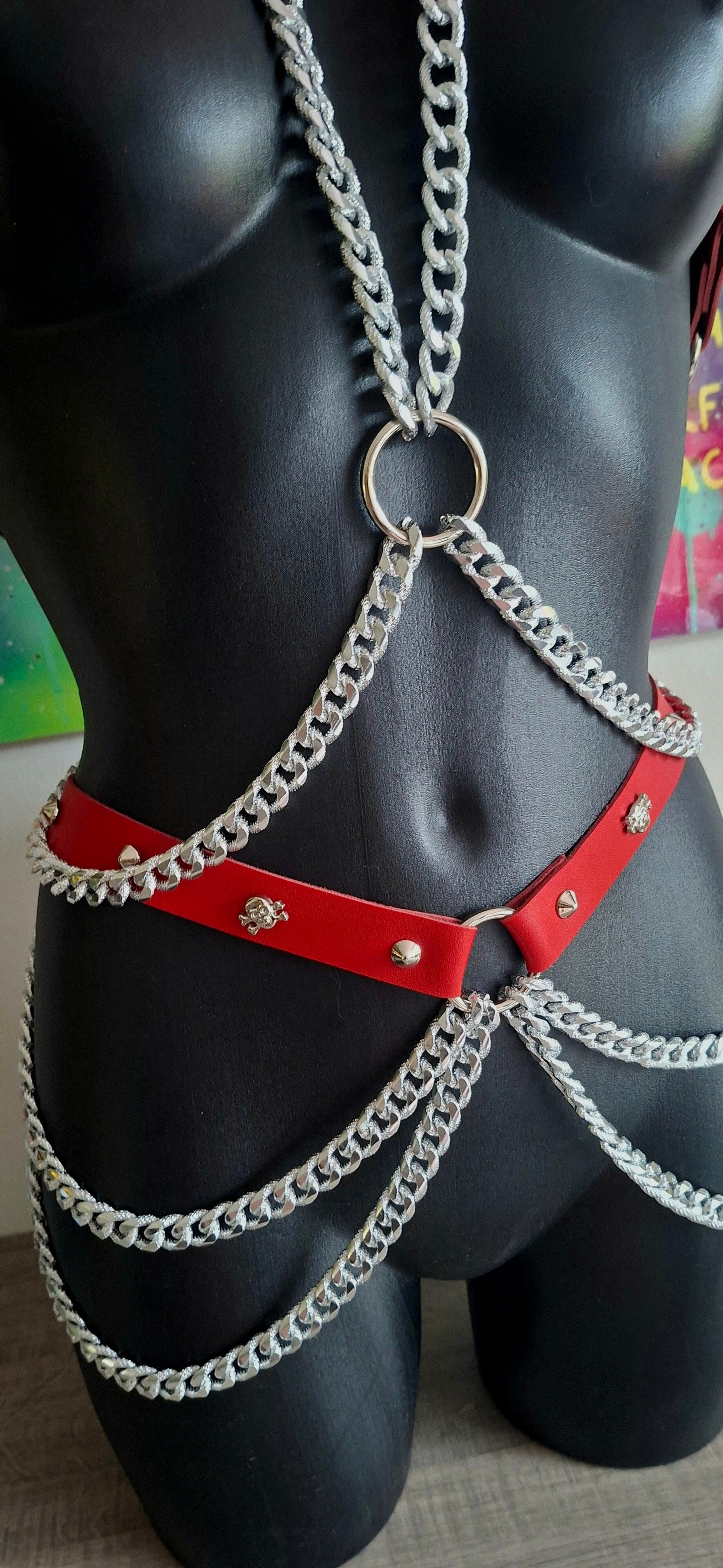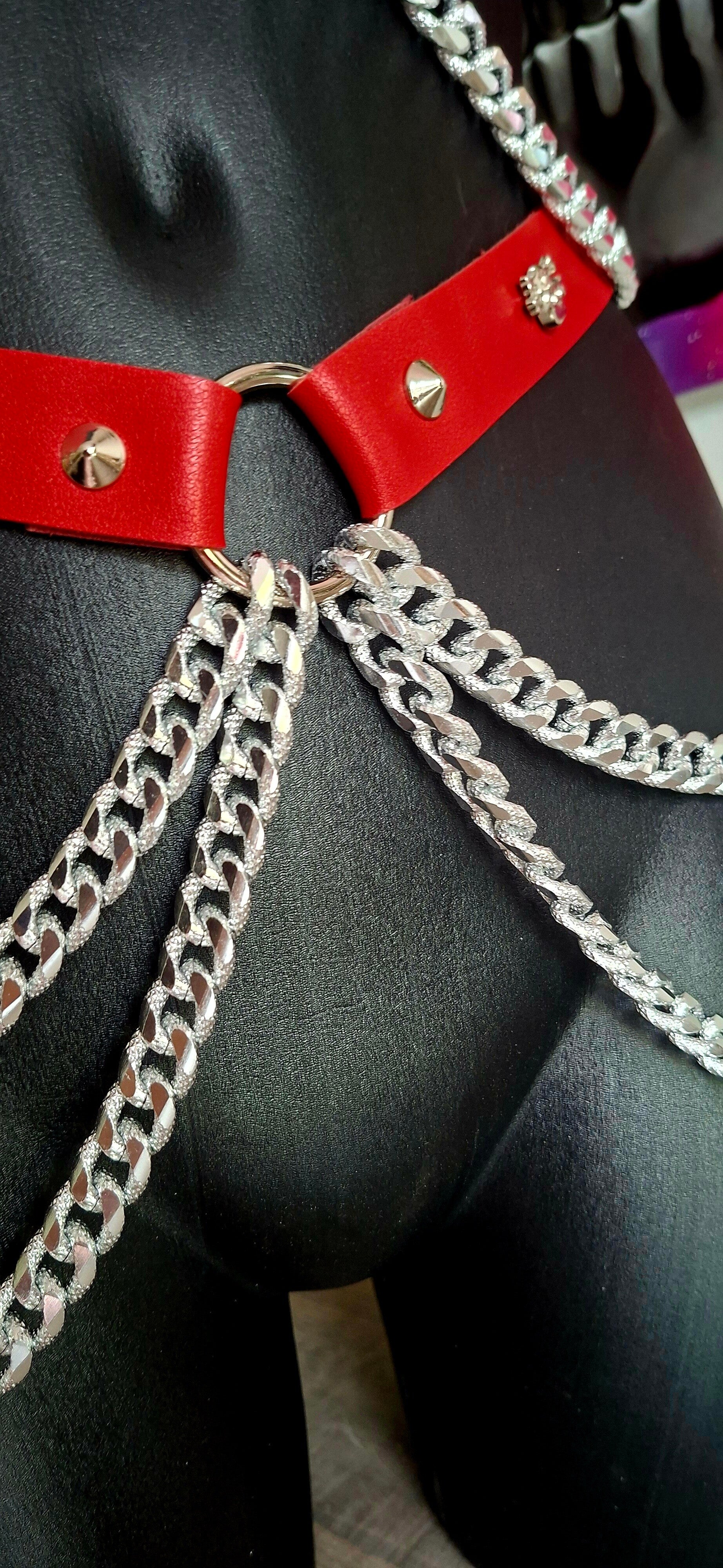 De Crimson Circuit is een statement harness waarin structuur en flow samenkomen. Vanuit de centrale ring vertakken fijne kettingen zich over het lichaam, waardoor een visueel netwerk ontstaat dat elke beweging volgt en versterkt.