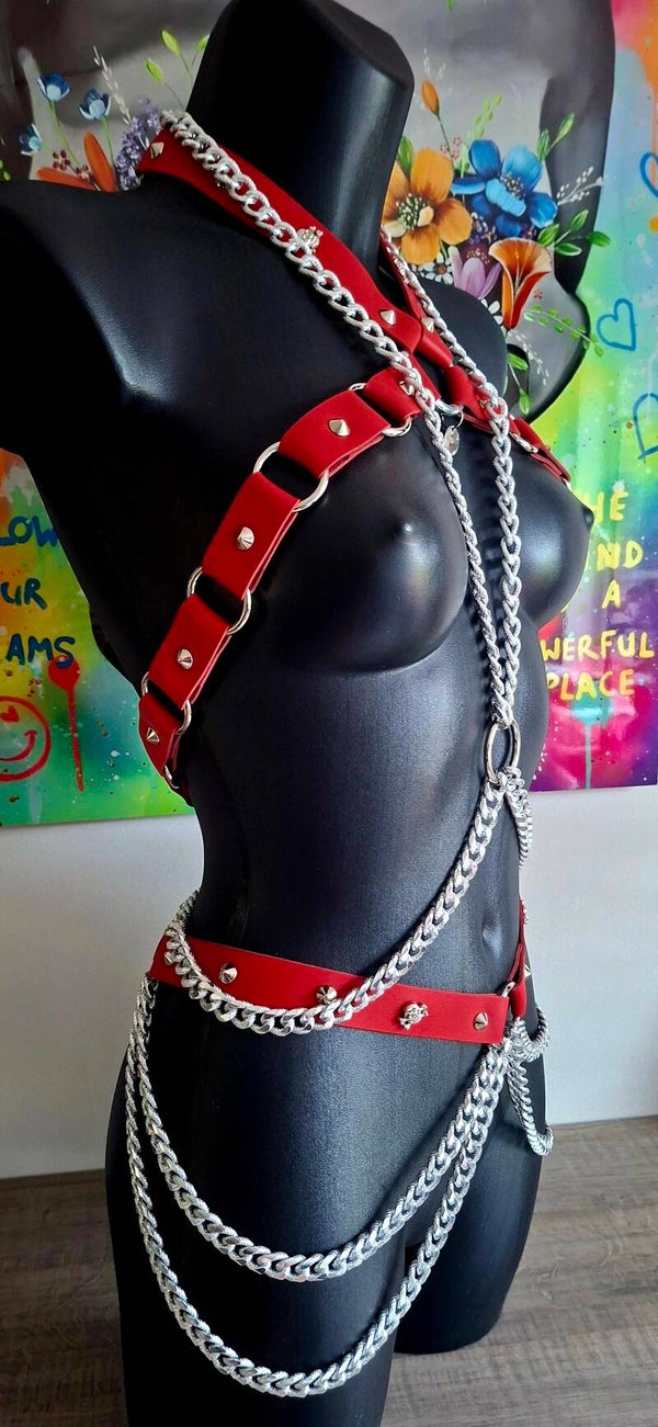 De combinatie van rood leer met zilverkleurige chains creëert een krachtig contrast, terwijl de opbouw van het ontwerp zorgt voor een gebalanceerde en doordachte uitstraling. Elk element is bewust geplaatst, waardoor het geheel niet alleen opvalt, maar ook klopt.