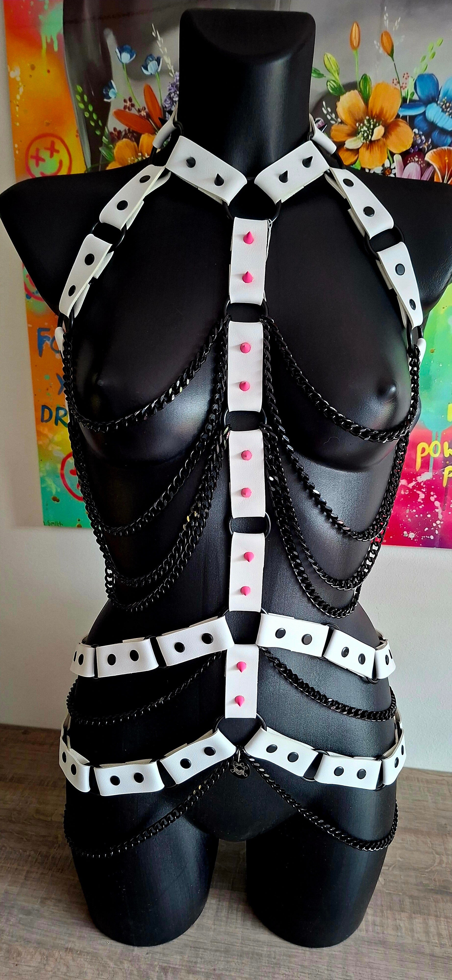 De Frostline is een uitgesproken harness waarin structuur en contrast samenkomen. De combinatie van wit leer en zwarte kettingen creëert een scherp visueel lijnenspel dat het lichaam omlijnt en versterkt.
