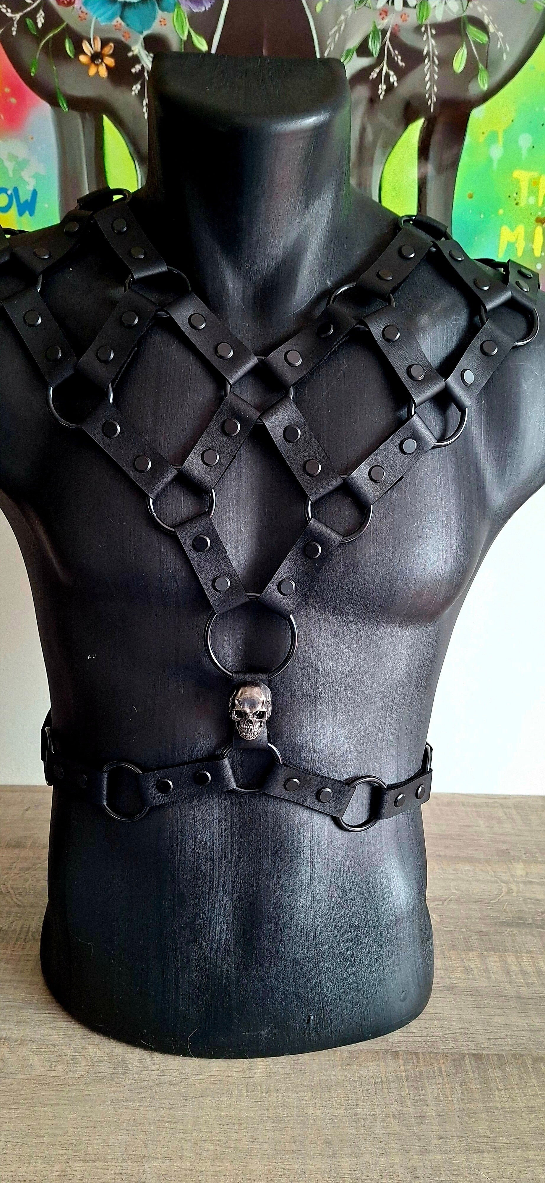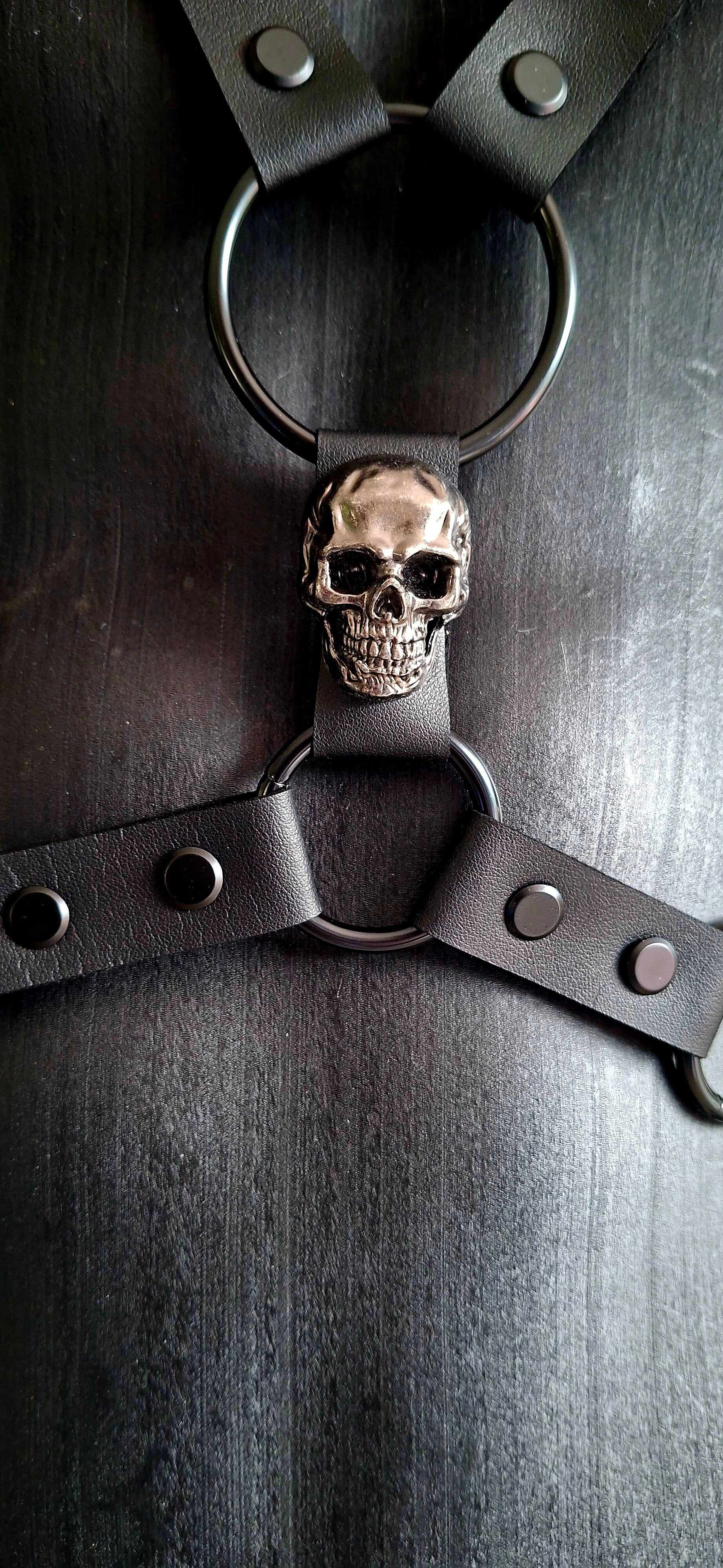 Het centrale skull-detail geeft dit harness een rauwe, donkere luxe uitstraling — perfect voor wie houdt van gothic, fetish, festival en alternative fashion.