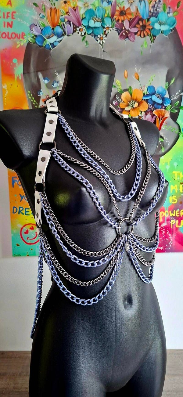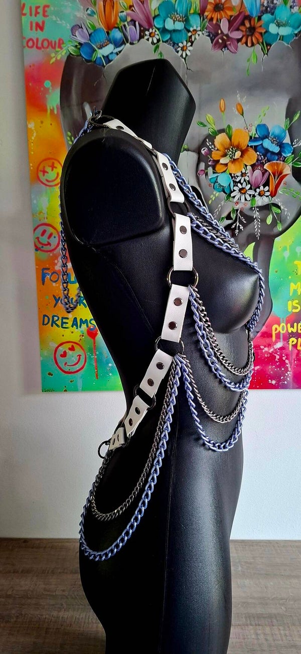 Verleidelijk, krachtig en onmogelijk te negeren. De Violet Vice Harness uit onze Link Theory Collection combineert frisse witte banden met luxe gunmetal hardware en opvallende Italiaanse paarse kettingen voor een unieke statement look.